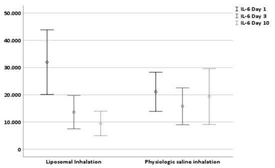 Effect of liposomal and physiologic saline solution inhalation on tracheal IL-6 level at day 1, day 3 and day 10 after tracheostomy.