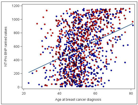 Association of ranked NT-proBNP values with age at breast cancer diagnosis among the 1160 participants included in the study. Ranked NT-proBNP values range from 1 (for the participant with the lowest original/raw NT-proBNP value) to 1160 (for the participant with the highest original/raw value). Anthracycline users are plotted in red and non-anthracycline users are plotted in blue. A least squares regression line is superimposed on the figure for ease of interpretation. Correlation = 0.36 (p < 0.001).