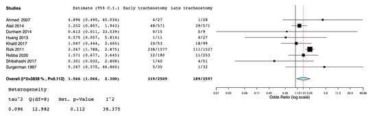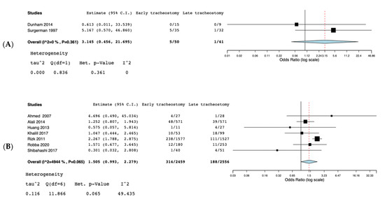 8. Siempos, I.I.; Ntaidou, T.K.; Filippidis, F.; Choi, A.M.K. Effect of early versus late or no tracheostomy on mortality and pneumonia of critically ill patients receiving mechanical ventilation: A systematic review and meta-analysis. Lancet Respir. Med. 2015, 3, 150–158. [Google Scholar] [CrossRef]