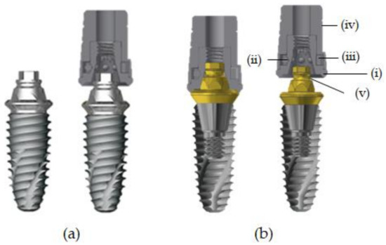 Cross section of both groups. (a) MLF (micro-locking one-piece fixture), (b) MLA (micro-locking abutment), (i) body, (ii) ball, (iii) spring, (iv) cap, and (v) retention groove.