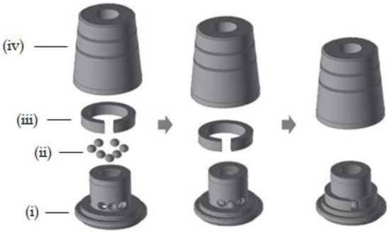Illustration of the cap assembly process. (i) Body, (ii) ball, (iii) spring, and (iv) cap.