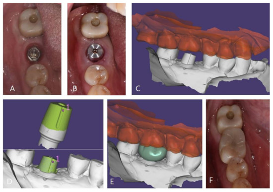Prosthesis setting process of the ML system. (A): Exposed connection of the ML system, (B): attached cap, (C): model scanned data, (D): superimposing pre-scanned cap data onto model scanned data, (E): designed zirconia crown, and (F): zirconia crown on the cap fixed with resin cement.