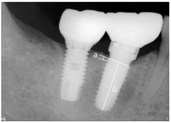 References used to measure actual marginal bone resorptions. (a) Marginal bone resorption and (b) implant fixture length.