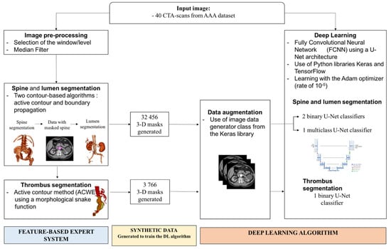 From the input CTA images, a feature-based expert system pipeline is applied, consisting in 3 sequential steps including image pre-processing, spine and lumen segmentation, and thrombus segmentation. The synthetic data generated by the expert system are used to train the DL algorithm. The DL algorithm uses either a combination of two binary U-Net classifiers, or a multi-class U-Net classifier to segment the lumen and the spine. A binary U-Net classifier is used for thrombus segmentation.