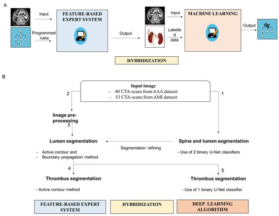 Segmentation of the vascular system using the hybrid approach combining the feature-based expert system with the deep learning (DL) algorithms. (A) General principles of expert system and hybrid approach using DL algorithm. In expert systems, input data are processed according to programmed rules to generate output data. In supervised machine learning, the system is fed with input images and labelled data to generate learnt rule. Hybridization consists of combining the two techniques. (B) Segmentation of the vascular system using the hybrid approach. The spine and the lumen are segmented using the DL algorithm (1). The lumen segmentation is then refined based on the application of the feature-based expert system following the following steps: image pre-processing (2) and application of active contour and boundary propagation methods (3). The thrombus is segmented using either the active contour method designed in the feature-based expert system (4), or the binary U-Net classifier from the DL algorithm (5).