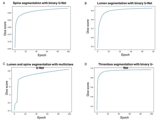 The convergence of the multiclass CNN model for spine and lumen segmentation was slower than the convergence of the two binary CNN models (Figure 3A–C). After 100 epochs, the training phase was stopped but was converged and the loss based on the Dice coefficient reached 82% (Figure 3C). The evaluation time of the multiclass model was equal to the evaluation time of one binary model. Therefore, the segmentation of the spine and the lumen with the multiclass model was twice as fast as with the binary model. However, the segmented lumen and spine regions proved to be qualitatively less accurate with the multiclass CNN, as shown by lower Dice scores (Figure 3). Therefore, the two binary U-Net classifiers were selected for lumen and spine segmentations for the further design of the hybrid approach. For the thrombus, after 100 epochs, the training phase was stopped and the loss based on the Dice coefficient reached 97% (Figure 3D). The training was performed in two hours using the 2D-U-Net CNN.