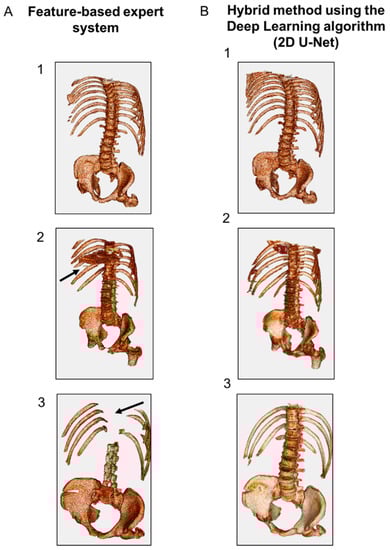 Representative 3D results of spine segmentation using: (A) feature-based expert system, and (B) hybrid method using the DL algorithm (2D U-Net). (1) Representative images obtained using the AAA data base showing similar performance between the expert system and the hybrid method. (2) Representative images obtained using the AMI database showing false-positive results with the expert system. (3) Representative images obtained using the AMI database showing false-negative results with the expert system.