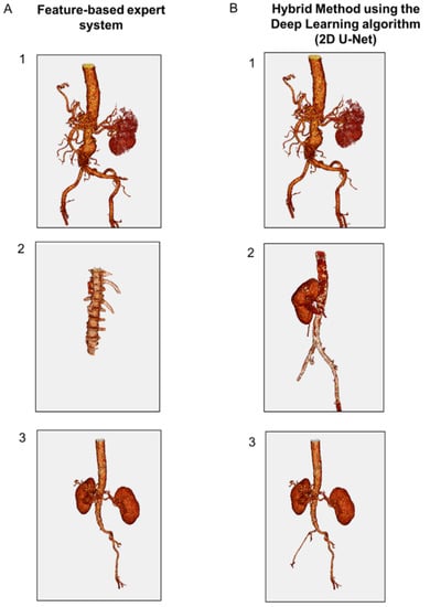 Representative 3D results of lumen segmentation using: (A) feature-based expert system, and (B) hybrid method using the DL algorithm (2D U-Net). (1) Representative images obtained using the AAA data base. Accurate segmentation by the expert system and the hybrid method (2) and (3) representative images obtained using the AMI database. In low-contrast images, the expert system fails to detect the vascular system while the hybrid approach provides an accurate detection.