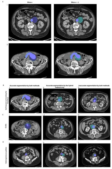 Representative images of thrombus segmentation obtained using the feature-based expert system (magenta pink) and the hybrid method (blue cyan). The merge is colored in blue purple. (A) Performance of the methods to detect the thrombus (slice n) and extend the detection over the z axis (slice n + 1) in a case where the section of the aneurysmal has an ellipsoid shape (1) and in a case where the aneurysmal aorta was curved (2). (B–D) Performances of the method in complex cases—(B) cases where the thrombus is surrounded by soft tissues, (C) cases with the presence of endografts, and (D) cases with poor-quality scans (large slice thickness or low contrast enhancement). (1) Accurate segmentation by both algorithms. (2) Accurate segmentation only with the hybrid method. (3) Inaccurate segmentation by both algorithms.