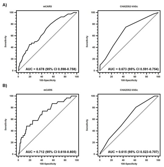Predicted 1-year stroke risks by CARS and CHA2DS2-VASc were compared using Wilcoxon signed rank test. Actual stroke risk at 1-year was determined as a percentage with 95% confidence intervals (CI). The predictive performance of mCARS for stroke events was investigated using receiver-operating characteristic (ROC) curves, and tested against the CHA2DS2-VASc score. Area under the curve (AUC) was used to reflect the c-index, which represents the ability of scores to predict events. A two-sided p value of <0.05 was considered statistically significant. Analyses were performed using SPSS software version 24.0 (SPSS, Inc., Chicago, IL, USA) and MedCalc v. 16.4.3 (MedCalc Software bvba, Ostend, Belgium).
