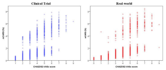 The following are available online at https://www.mdpi.com/article/10.3390/jcm10153357/s1, Table S1: Baseline characteristics stratified by the CHA2DS2-VASc score in clinical trials, Table S2: Baseline characteristics stratified by the CHA2DS2-VASc score in the real-world.