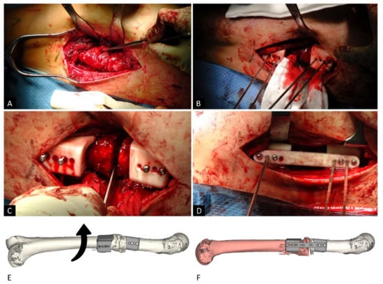 Surgical technique (Patient 3). After exposing the femoral diaphysis through a postero-lateral approach (A), the two initial surgical guides are pinned to the bone surface (B). Subsequently, the osteotomy is carried out by removing all previous osteosynthesis material (C). The correction is performed with an external or internal rotation of the distal femoral fragment and the third 3D- printed guide is used to connect the other two, providing the correct femoral rotation degree (D). The degrees of rotation of the distal femoral fragment are defined by the alignment of the two guides (E). Once the two guides are aligned and connected by the third piece, the distal fragment is already correctly rotated according to the surgical planning (F). Finally, the osteotomy is completed by inserting the intramedullary nail and removing the surgical guides.