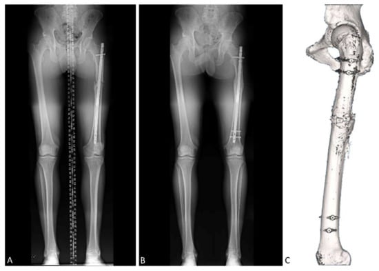 Pre- and postoperative image study (Patient 3). Teleradiographs are conducted to observe rotation before (A) and after surgery (B). It also indicates callus formation over time. The CT scan also indicates whether the alignment of the femur is correct after surgery (C).