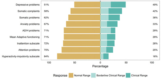 ASEBA ASR raw data was entered into assessment data manager (ADM, version 9.0) ASEBA scoring software (https://adm-assessment-data-manager.software.informer.com/9.0/, accessed on 1 June 2021), which produces detailed profiles on multiple aspects of psychological functioning. For this study, data from the DSM-Oriented Scale for AD/H, as well as the Attention Problem Syndrome scale, Depression scale, Somatic Complaints scale, and Mean Adaptive Functioning scale, were utilized. Subjects with T-scores in the borderline-clinical and clinical ranges were considered to have symptoms for the purposes of this study.