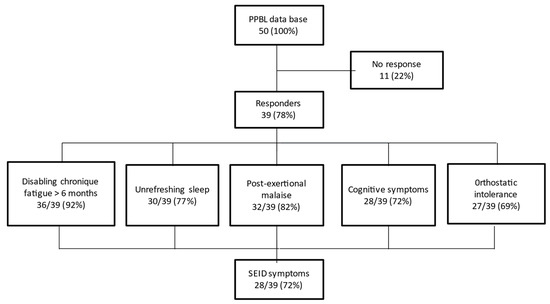 Among 39 evaluable patients, 28 (72%) fulfilled the SEID symptoms criteria, with the presence of the 3 mandatory criteria (disabling chronic fatigue, unrefreshing sleep, PEM) and at least 1 of the 2 optional criteria (cognitive disorders, OI) (Figure 1). However, 3 patients did not mention any symptoms and remained fully asymptomatic during follow-up.