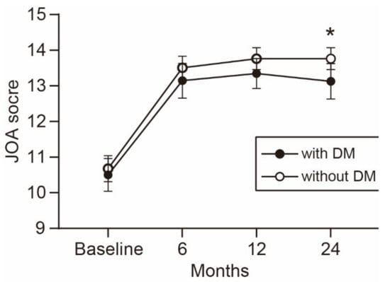 Time-dependent change in the JOA score. The average JOA score was consistently lower in patients with than without DM during the observation period. The difference between the groups increased over time and reached statistical significance at the 2-year follow-up. * p < 0.05, unpaired t-test. JOA, Japanese Orthopedic Association; DM, diabetes mellitus.
