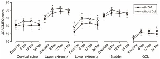 Time-dependent change in JOACMEQ scores. The difference in lower extremity function was significant during the observation period, except for the 1-year follow-up. The difference in upper extremity function showed statistical significance at the 6-month follow-up. The difference in the QOL domain between the groups increased over time and reached statistical significance at the 2-year follow-up. * p < 0.05, unpaired t-test. JOACMEQ, Japanese Orthopedic Association Cervical Myelopathy Evaluation Questionnaire; DM, diabetes mellitus; QOL, quality of life.
