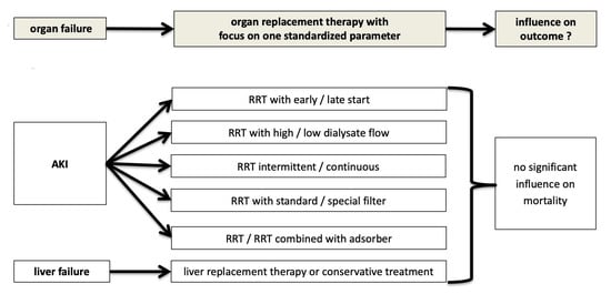 Bacterial toxins and an excessive cytokine response are the main causes of the development of sepsis or are responsible for their effects in the body, including the development of organ failure. Adsorbers have been developed to adsorb cytokines and/or toxins in parallel with renal replacement therapy in order to address sepsis and the cytokine storm in addition to the therapy of AKI []. Furthermore, very high dialysate flows and different filtration techniques or special filters were used in some cases. In smaller studies, such procedures sometimes showed a positive effect on the outcome. Although all these techniques are able to reduce cytokines or bind bacterial toxins, the promising results of smaller studies regarding outcome have mostly not yet been confirmed in larger studies [,].
