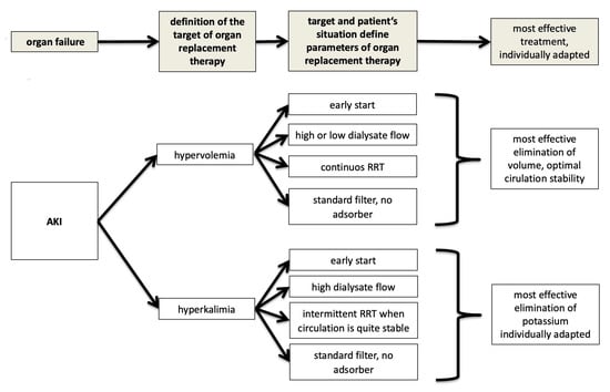 Therefore, the expected positive influence of an individually tailored renal replacement therapy on outcome—from a nephrological point of view—is only possible by an individually customized, case by case approach. The first step then focuses on why, or with what target, dialysis should be started. The second step regards the demands on the parameters of dialysis, e.g., dialysate flow or ultrafiltration, which are essential to actually reach the initially defined target by dialysis. Thirdly, the defined parameters have to be individually tailored to the patient, maybe even adjusted over time according to the patient’s progress. This individualized approach reflects the role of a nephrologist in a multidisciplinary team related to their competence in the management of AKI including extracorporeal treatment options []. Moreover, a nephrologist provides experience for critically ill patients with complex diagnoses and AKI and ideally supports the education in this field to help to assess quality and improve care [].