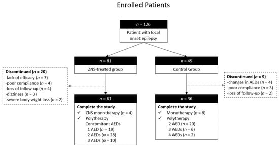 Figure 1 illustrates the algorithm of the selection patient in the present study. Of the 81 patients in the ZNS-treated group, 20 patients (24.7%) discontinued the study. In the control group, nine patients (20.0%) discontinued the study.