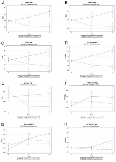 Plots of effects of zonisamide therapy, time fitted by generalized estimating equation (GEE) and adjusted for sex, age, and dependent variables (Y-axes) at baseline. (A) body weight; (B) body mass index; (C) hepatic steatosis index; (D) glycosylated hemoglobin; (E) triglycerides; (F) total cholesterol; (G) low-density lipoprotein cholesterol; (H) high-sensitivity C-reactive protein. Group 0, Control group; Group 1, Zonisamide group; time 0, baseline; time 1, 12 weeks; time 2, 24 weeks. We used GEE analysis rather than the two-way ANOVA because it was more appropriate for our data. BW, body weight; BMI, body mass index; HSI, hepatic steatosis index; HbA1c, glycosylated hemoglobin; TG, triglycerides; T-CHOL, total cholesterol; LDL-C, low-density lipoprotein cholesterol; hs-CRP, high-sensitivity C-reactive protein.