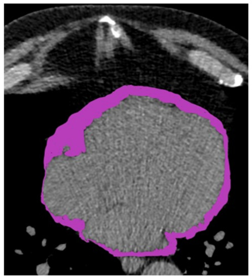 To isolate the adipose tissue (fat)-containing voxels, a threshold of −250 to −30 HU was applied after the segmentation of the heart and surrounding adipose tissue from the remainder of the thorax (see Figure 1). These voxels were then summed to obtain adipose tissue volume (mL) [7,10,19]. In order to assess the accuracy of PAT determination, PAT measurements were performed by two independent investigators who were blinded to patients’ clinical records.