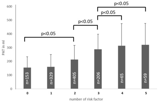 We could observe a constant increase in PAT volume with a number of cardiovascular risk factors, up to 320 ± 157 mL in patients with five cardiovascular risk factors. As depicted in Figure 2, patients without cardiovascular risk factors showed a significantly lower PAT volume of 153 ± 155 mL compared to patients with more than one risk factor, p < 0.05.