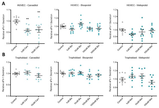 Treatment of primary HUVECs with the beta-blocker carvedilol significantly reduced the secretion of anti-angiogenic factor sFlt-1 (Figure 1A). The other two beta-blockers investigated, bisoprolol and metoprolol, did not affect sFlt-1 secretion from primary HUVECs. In primary human trophoblasts and placenta explants, all three beta-blockers had no effect on sFlt-1 secretion (Figure 1B,C, respectively).