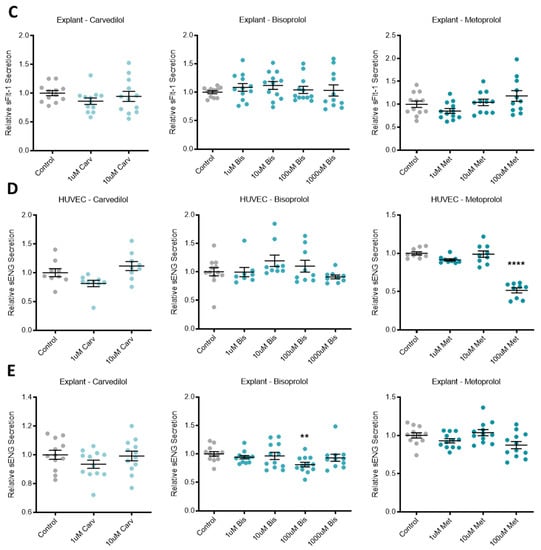 Beta-blockers had limited effect on secreted anti-angiogenic factors across different tissue types. Relative sFlt-1 secretion in HUVCEs (A) was significantly reduced with carvedilol (Carv) treatment, but not bisoprolol (Bis) treatment or metoprolol (Met) treatment. Relative sFlt-1 secretion was unchanged in trophoblasts (B) and explants (C) following beta-blocker treatment with Carv, Bis and Met. In HUVEC, relative sENG secretion (D) was decreased with treatment at the top dose of Met, but unchanged with Carv and Bis treatment. In explants, relative sENG secretion (E) was decreased with treatment at 100 uM Bis, but unchanged at the other doses or with Carv or Met. Data are mean ± SEM, expressed relative to control, n = 3–4, ** p < 0.01, **** p < 0.0001.