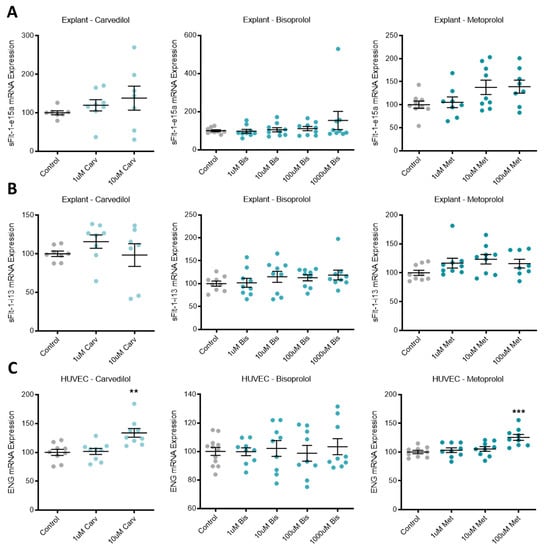 In primary human placental explants, mRNA expression of the sFlt-1 isoforms, sFlt-1-e15a and sFlt-1-i13 were not affected by treatment with any of the beta-blockers investigated (Figure 2A,B, respectively). Expression of ENG mRNA in primary HUVECs was significantly increased with top dose carvedilol (10 uM) and metoprolol (100 uM), but not bisoprolol at any dose (Figure 2C).