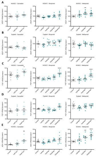 Expression of pro-angiogenic factors VEGF, PGF, and ADM were increased by different beta-blocker treatment of primary HUVECs. VEGF mRNA expression was upregulated by metoprolol (Figure 3A), PGF by carvedilol, bisoprolol and metoprolol (Figure 3C), and ADM by carvedilol and metoprolol (Figure 3E). Neither VEGF nor PGF mRNA expression was differentially regulated in primary human explants following beta-blocker treatment (Figure 3B,D, respectively).