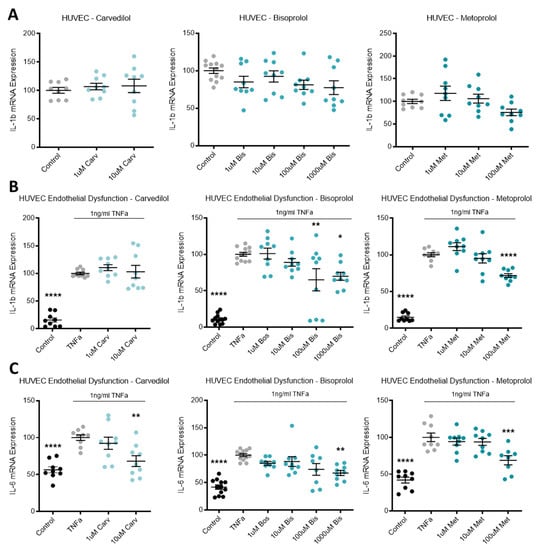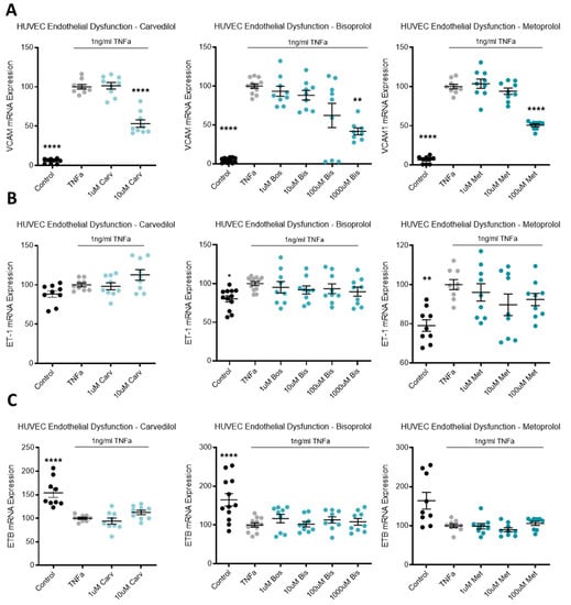 TNFα was used to induce endothelial dysfunction in primary cultured HUVECs. Compared to the no-TNFα control, TNFα significantly upregulated VCAM mRNA (Figure 6A). The top dose of each beta-blocker, carvedilol, bisoprolol, and metoprolol, significantly reduced VCAM mRNA expression (Figure 6A). In the same model of endothelial dysfunction, ET-1 and its receptor, endothelin-1 receptor B (ETB), mRNA expression was not affected by beta-blocker treatment (Figure 6B,C, respectively).