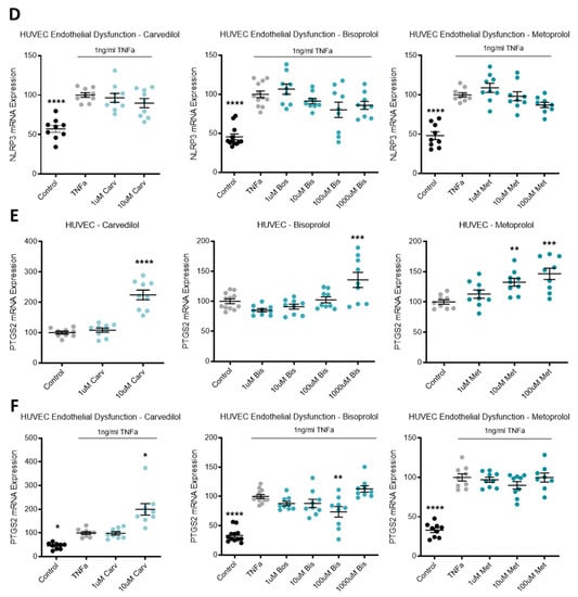When TNFα was added to HUVECs to induce endothelial dysfunction, IL-1b expression was significantly increased from control levels and decreased with doses of bisoprolol and metoprolol, but not carvedilol (Figure 4B). TNFα induced endothelial dysfunction also significantly increased mRNA levels of IL-6 (Figure 4C), NLRP3 (Figure 4D) and PTGS2 (Figure 4F). Beta-blocker treatment with top dose carvedilol, bisoprolol, and metoprolol significantly decreased induced IL-6 expression (Figure 4C). NLRP3 mRNA expression was not affected by beta-blocker treatment (Figure 4D). PTGS2 expression increased with top dose carvedilol, decreased with 100 uM bisoprolol, and was unaffected by metoprolol (Figure 4F).