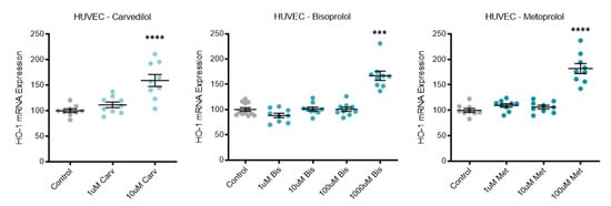 Expression of the antioxidant enzyme HO-1 was significantly increased in HUVECs following top dose treatment with carvedilol, bisoprolol, and metoprolol (Figure 5).