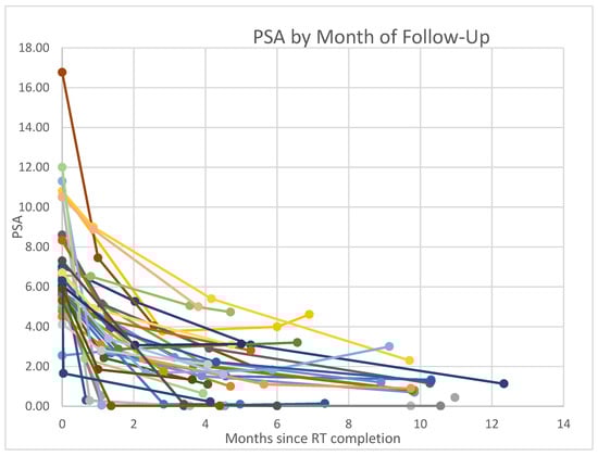 In terms of PSA control, the median pre-treatment PSA was 6.30 ng/mL (range 2.55–16.77). As indicated in Figure 1, the PSA levels decreased by months from RT completion. Median decrease from pre-treatment PSA to PSA at first follow-up is 3.45 ng/mL (range 0.24–11.24 ng/mL). On 33 patients with second follow-up PSA available, median PSA decrease was 4.66 ng/mL (range 1.03–12.74 ng/mL) from pre-treatment levels. Seventeen patients had PSA levels available at third follow-up, with a median PSA decrease of 5.68 ng/mL (range 1.8–14.9 ng/mL) from pre-treatment levels. A repeated-measures ANOVA determined that decrease in PSA across the different time points was statistically significant (p < 0.0005). A post hoc pairwise comparison using the Bonferroni correction showed a decrease in PSA between pre-treatment PSA and PSA at first follow-up, as well as PSA at first follow-up and follow-ups 2 and 3 (p < 0.005). However, there was no statistically significant difference between PSA at second and third follow-up (p = 0.1).