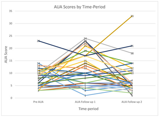 Toxicity was assessed using patient-reported AUA scores, and the median pre-treatment AUA was 7 (range 1–23). There were no grade 3 or higher toxicities in our patient population. Grade 1–2 urethritis was primarily seen during first follow-up appointment in 14 out 35 (40%) of patients, whereas it was only seen in 6 out of 34 (18%) patients on second follow-up and in 1 out of 17 (5.8%) on third follow-up. For analysis of trends, we used AUA scores for pre-treatment and follow-ups 1 and 2 from 27 patients that had complete data scores for these time points. Within this cohort of patients, there was an expected increase in the AUA score at first follow-up with a mean of 14.58, and it gradually decreased back to baseline in subsequent follow-ups (mean 7.75 at second follow-up) (Figure 2). A repeated-measures ANOVA determined that mean AUA values differed significantly across the three time points (p = 0.04).