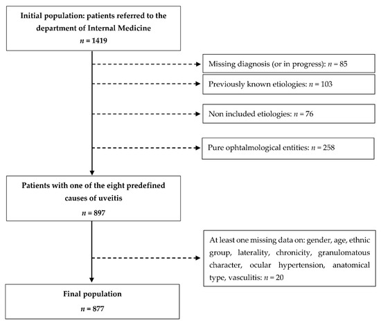 Eight causes of uveitis were selected for the study: spondyloarthritis and HLA-B27-related uveitis, Behçet’s disease, sarcoidosis, multiple sclerosis, tuberculosis, lymphoma, idiopathic uveitis, and one category grouping a small number of other inflammatory diseases, considered as a unique etiology. In the training dataset, the etiology of uveitis corresponded to one of the selected causes for 897 patients and, of these, 877 had no missing data on the factors studied (Figure 1). The number of patients included in the test dataset was 154.