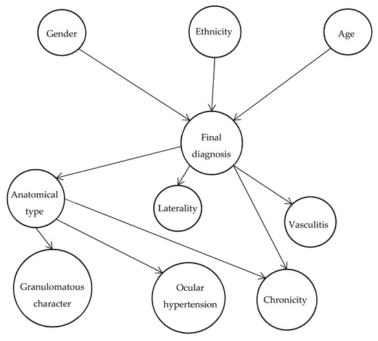 Bayes’ theorem links the degree of belief in a proposition before and after accounting for new information. This theorem has been used as a basis for the development of some artificial intelligence algorithm, named Bayesian belief networks. The use of such networks has been previously reported for the differential diagnosis of a wide variety of medical conditions, such as dementia or breast lesions [23,24]. Gonzalez-Lopez et al. applied this technique to the differential diagnosis of anterior uveitis [25].