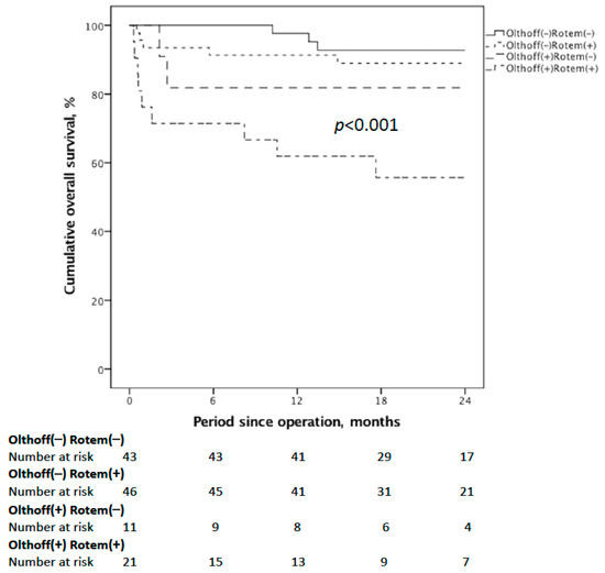 Cumulative OS curves for those meeting the Olthoff’s definition or 24 h post-LDLT ROTEM or not. ROTEM (+) is defined as at least one of the two above-mentioned 24 h post-LDLT ROTEM parameters being prolonged beyond the optimal cut-off values as mentioned. The Olthoff (+) ROTEM (+) group had the worst OS (p < 0.001).