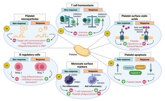 Potential diagnostic approaches for assessment of therapeutic responses in ITP. Promising diagnostic approaches for prediction of platelet count responses and thereby distinguish therapeutic responders from non-responders are depicted: T cell homeostasis (D1), Platelet surface sialic acids (D2), Platelet apoptosis (D3), Monocyte surface markers (D4), B regulatory cells (D5) and Platelet microparticles (PMPs). Each approach indicates therapeutic non-response vs. response, with their effects (+ indicates a stimulatory effect and - an inhibitory effect) on the features of the ITP pathophysiology. So far, the initial preliminary evidence may support the involvement of the following therapeutic modalities in relation to the diagnostic approaches: (D1) glucocorticosteroids, high-dose dexamethasone, IVIg, low-dose decitabine, TPO-RA; (D2) Corticosteroids, IVIg, TPO-RA; (D3) IVIg; (D4) glucocorticosteroids; (D5) TPO-RA; (D6) Corticosteroids, TPO-RA. This figure was created with BioRender.com.