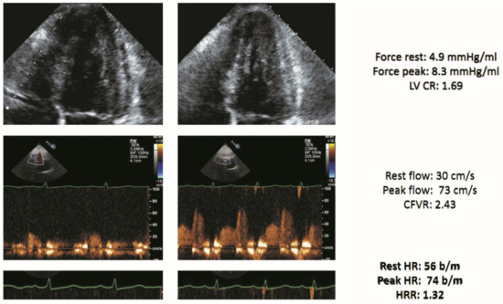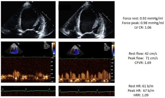 - Ciampi, Q.; Zagatina, A.; Cortigiani, L.; Gaibazzi, N.; Daros, C.B.; Zhuravskaya, N.; Wierzbowska-Drabik, K.; Kasprzak, J.D.; Pretto, J.L.C.S.; D’Andrea, A.; et al. Functional, Coronary Anatomic and Prognostic Correlates of Coronary Flow Velocity Reserve during Stress Echocardiography. J. Am. Coll. Cardiol. 2019, 74, 2278–2291. [Google Scholar] [CrossRef] [PubMed]