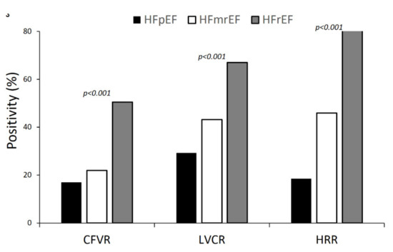 Abnormalities of LVCR, CFVR, and HRR abnormalities were more prevalent in patients with HFrEF when compared to in those with HFmrEF and HFpEF (p < 0.001) (Figure 3).