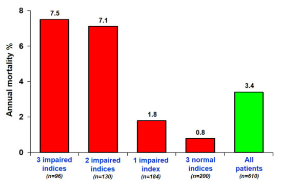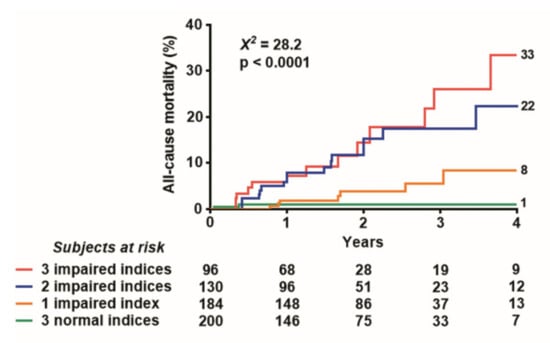 For the primary end-point of all-cause death, a reduced CFVR (HR = 4.071; 95% CI: 1.643–10.087; p = 0.002) was the only independent predictor (Table 3).