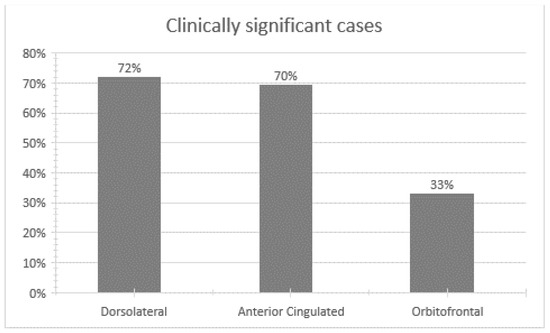 Regarding the clinical involvement of these patients in the three fronto-subcortical syndromes, we found that a large percentage of our patients presented a clinically significant score on the three syndromes, especially in the dorsolateral and anterior cingulate syndrome, with a lower proportion of patients with the orbitofrontal syndrome. The presence of these syndromes is understood as an indicator of behavioral abnormalities related to the frontal system [38]. Therefore, these results suggest that a large percentage of patients with schizophrenia with a predominance of NS present possible involvement of the three fronto-subcortical circuits.