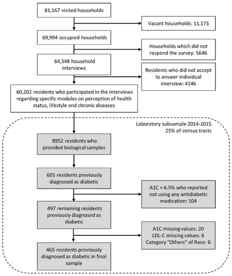 As shown in Figure 1, of the 81,167 households selected, 11,173 were vacant and 5646 did not respond, leaving 64,348 for interviews. After excluding 4146 residents who did not accept to answer the specific questionnaire or had their information rejected by the automatic coherence screening carried out by the IBGE, 60,202 (86%) were available for analyses []. Among the subsample selected for the collection of biological samples, 8952 (52%) provided samples [], and among them, 601 reported having a previous diagnosis of diabetes. We excluded 104 individuals with A1C levels < 6.5% who were not using antidiabetic medication since they were unlikely to have diabetes. We further excluded those with missing A1C (n = 20) and LDL-C (n = 6) values and, due to small numbers, those declaring to be Asian or indigenous (n = 6). Thus, the final study sample was composed of 465 subjects with diabetes.