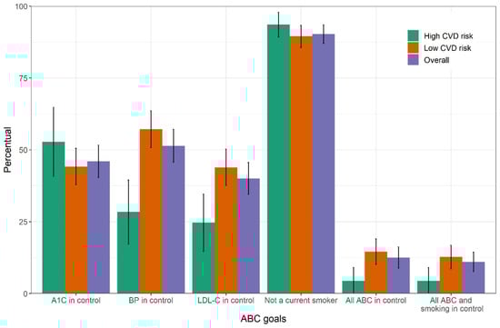 Given the response rate obtained, we used post-stratification survey weights to make results nationally representative. Following recommendations [], these weights were calculated according to sex, age, education, and race according to region, from the total sample of the PNS. The reported proportions, means, standard deviations (SD), and confidence intervals (CI) were all weighted estimates. Association of socio-demographic and clinical characteristics with A1C levels was evaluated using a chi-square test with the Rao–Scott adjustment []. Mean differences between high and low CVD risk were evaluated through a t-test, while proportion differences were assessed by chi-square test. To evaluate factors associated with glycemic control (A1C < 7%), and with overall ABC control (attainment of two or more ABC goals), Poisson regression models were fitted to the data, with post-stratification weights. Prevalence ratios (PR) with 95% CI were estimated using a robust variance estimator, in these adjusted models. Data analysis was performed using statistical software R, version 4.0.4 [], with the survey package [].