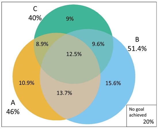 Figure 3 shows the intersections between the sets of subjects attaining each ABC goal. In general, there was a large overlap in the individual goals achieved. Aside from the 12.5% achieving all targets, 13.7% achieved both A1C and blood pressure targets, 9.6% achieved both blood pressure and LDL-C targets, and 8.9% achieved both A1C and LDL-C targets. Only 20% of the sample did not achieve any goal.