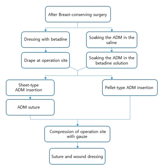 In breast reconstruction, ADM is generally used as a material for covering implants [4]. It is increasingly being used in the reconstruction of nipple-sparing mastectomy and skin-sparing mastectomy via implant insertion in recent years [5,6]. How to use the ADM of breast surgery is already in place, and its safety has been established [7,8]. However, there have been rare reported cases of reconstruction using the ADM in BCS. The ADM is a useful method for the wide excision of breasts, and several methods have been devised to improve the most common problem: infection.