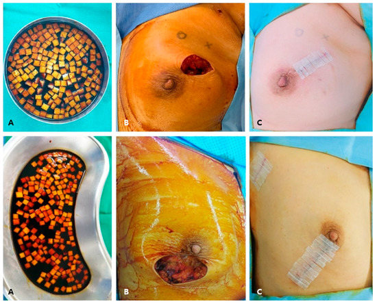 BCS with radiation therapy has developed because of the advantage of preserving the breast shape, and shows a similar oncological outcome compared to mastectomy [10]. As seen from the first radical mastectomy and the development of modified radical mastectomy to BCS, the surgical site was gradually minimized [11]. However, in BCS, extensive resection leaves a defect (Figure 4A), and a technique that can compensate for this is reconstruction using the ADM (Figure 4B). This method can maintain the shape of the breast, keeping it similar to that before surgery. In addition, it can be reconstructed quickly (Table 1), reducing the operation time compared to other reconstruction methods. In particular, when the pellet-type ADM was used for reconstruction, the shape of the breast reconstruction was more similar to that before surgery (Figure 5A,B), and patient satisfaction was high.