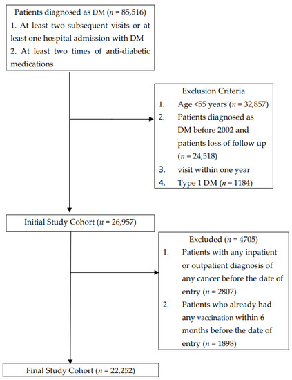 We used the nationwide database, National Health Insurance Research Database (NHIRD) to analyze the influence of influenza vaccination on lung cancer among diabetic patients. The Taiwan National Health Insurance (NHI) program, established in 1995, is a national comprehensive health insurance provided to all residents of Taiwan and more than 98% of the total population is covered under the NHI program. We screened patients who visited all healthcare facilities with a diagnosis of type 2 diabetes mellitus (DM) (International Classification of Disease, the 9th Revision, Clinical Modification Code) over an 11 year period (n = 151,605) from 1 January, 2002 to 31 December, 2012. Patients with 1. at least two subsequent DM visits or one hospital admission with a diagnosis of DM and 2. at least two incidences of using diabetic medications (n = 85,516) were included in the study. The initial study cohort included 26,957 DM patients after exclusion of those with 1. age <55 years (n = 32,857), 2. diagnosed as DM before 2002 (n = 24,518) and 3. type I DM (n = 1184). The final study cohort included 22,252 DM patients after further exclusion of those 1. diagnosed with any cancer (n = 2807) and 2. that took any vaccination within 6 months (n = 1898) before the date of entry (Figure 1).
